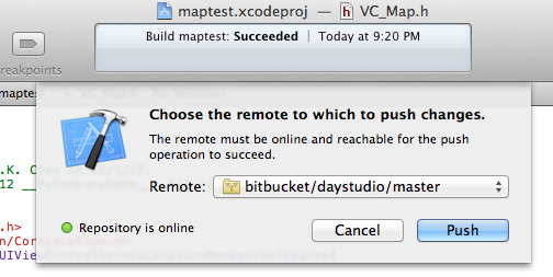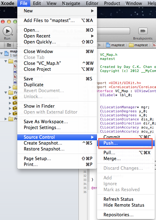 2. File -> Source Control -> Push. If the local git is not yet committed, Xcode will ask you to commit local git first.