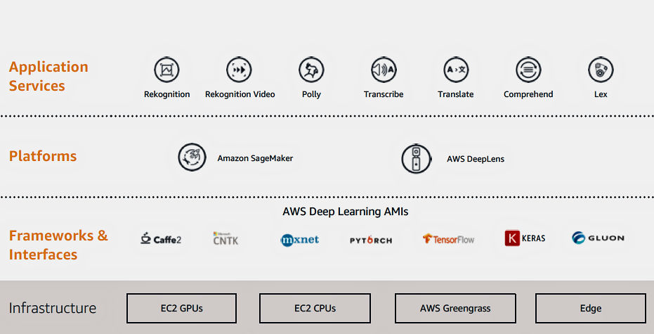 而通用平台上,各個雲端供應商,都已經發展出人工智能專屬的設備。只是還是初步設置,未及完善。例如 Amason AWS 上面,EC2 是有專為智能而設計的硬件配置,可以特別適切到 PyTorch 或 TensorFlow 的專屬硬件配置。AWS 也有 SageMaker 的專屬服務,專為智能的模型訓練 (Training),和部署 (Deployment) 和建設/實施 (Build / Implementation) 用的平台。