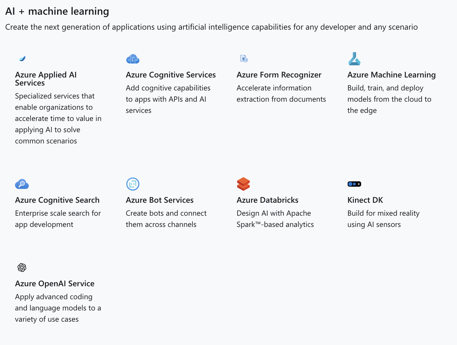 Microsoft 的 Azure 雲端平台,因為與 OpenAI 關係密切也有著優勢。主要平台除了 OpenAI,也有 Azure Machine Learning,用作訓練、建設和部署。(下圖截自 Azure Cloud)