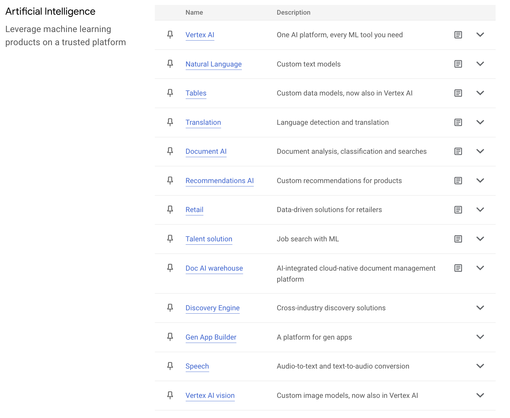 Google 在人工智能的研究 (2011) 比 OpenAI (2015.12) 還早,所以在它的雲端平台 GCP 上,是比起其他雲端平台在智能的發展上更充份。在 GCP 上面,專業用的智能平台包括 Vertex AI 和 Tensorflow / TPU;還有一大堆人工智能功能,例如電腦視覺 (Computer Vision)、語言 (Natural Language)、語音 (Speech)、文件分析、翻譯、通話機器用的 Dialogflow (Chatbot) 等等的功能平台。(下圖截自 Google GCP)