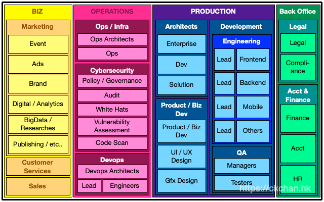 電腦從業人員會在不同類型公司內工作;例如公司可以是以軟件或科技平台或主要產品,或不是科技產品(例如農業或電力公司內的電腦部門)。這些下篇會講解。講下去之前,先講解下科技部門有甚麼類別。以上這個圖是我自己造的,都是些多年的管理心得。